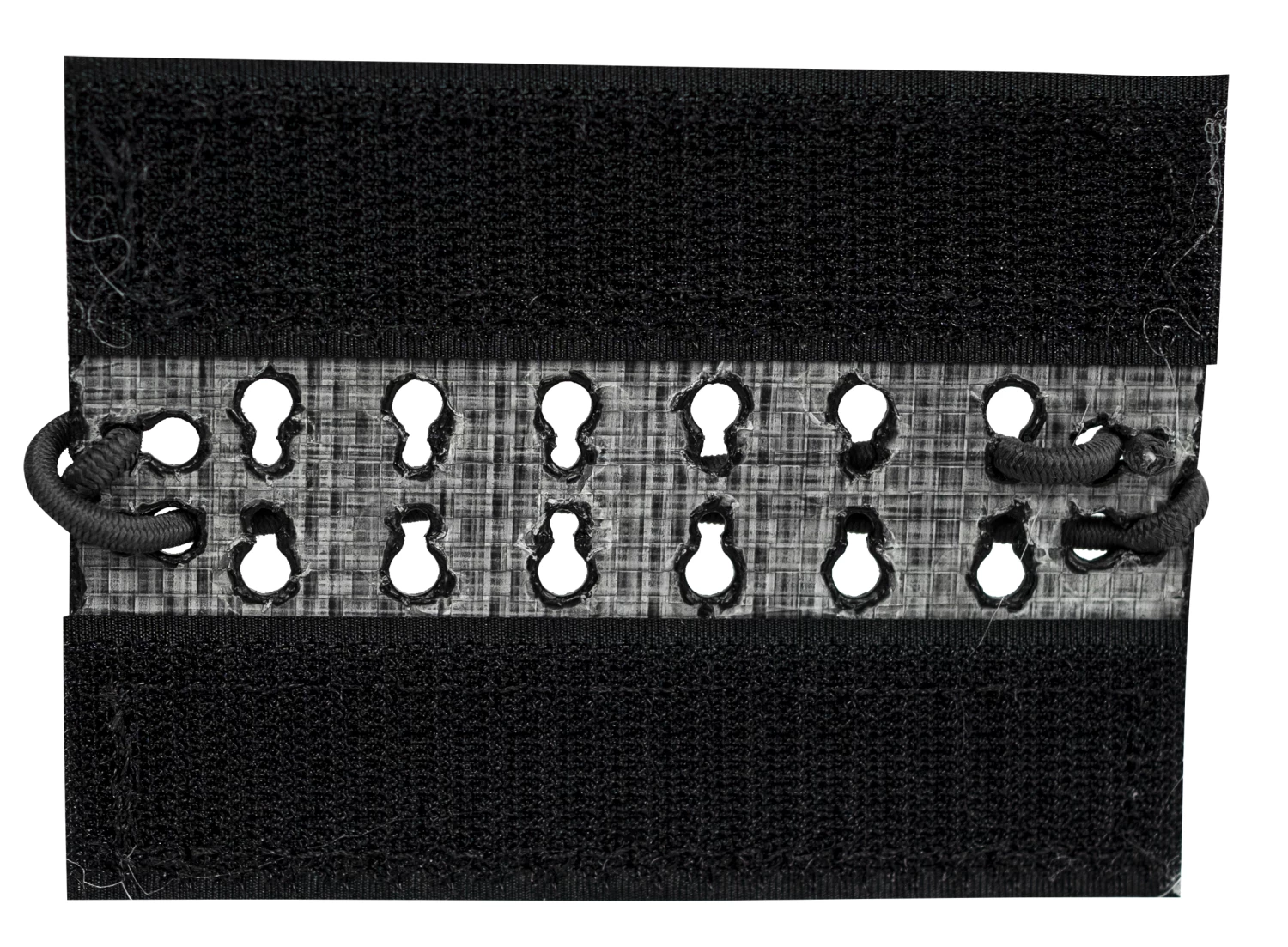 Die 8-Lock Technologie ist von Blackfolium patentiert und sorgt für einen sicheren Halt der Ausrüstung. Die achtförmigen Löcher sorgen dafür, dass das Bungee Cord in der breiteren Seite eingefädelt und an der schmaleren Seite eingespannt werden kann, sodass das zu fixierende Objekt nicht verrutschen kann. Man kann die Schlaufengröße also genau an das zu befestigende Objekt anpassen. Wenn man ein Objekt aus den Schlaufen entfernt, so verlieren die anderen Schlaufen durch die 8-Lock Technologie ihre Spannung nicht. Auf der Rückseite der Platte sind Velcro-Hakenflächen angebracht, sodass man die Platten an allen Rucksäcken, Taschen, Beutel, Westen und Plattenträgern mit Velcro-Plüschflächen anbringen kann.