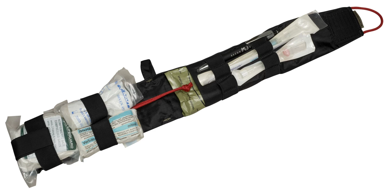 Das Blackfolium RIFAK (Rip-Away IFAK) ist eine praktisches Medic-Kit, um alle wichtigen Artikel bei sich zu tragen, wenn Personen nach dem MARCH-Protokoll erstversorgt werden müssen. Dank des innovativen Designs kann der Nutzer die medizinischen Gegenstände in weniger als 6 Sekunden erreichen. Durch seine durchdachte Konstruktion ist der innere Teil der Tasche so konstruiert, dass er die medizinischen Artikel auch bei schnellem herausziehen noch in sich behält. Das RIFAK ist in seinem Aussehen unauffällig gehalten, sodass es auch bei verdeckten Operationen genutzt werden kann. Per Gummizug auf der Vorderseite kann man das RIFAK komprimieren und so einen sicheren Sitz der Artikel im Inneren gewährleisten. Außerdem kann man den Gummizug auch nutzen, um ein Tournique oder ähnliches anzubringen. Durch die seitliche angebrachten PALS/MOLLE-Bänder können zusätzliche Taschen oder weitere Werkzeuge wie Scheren/ Gutschneider etc. angebracht werden.