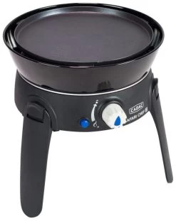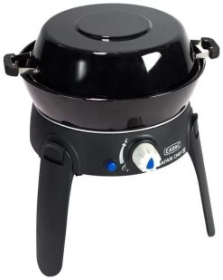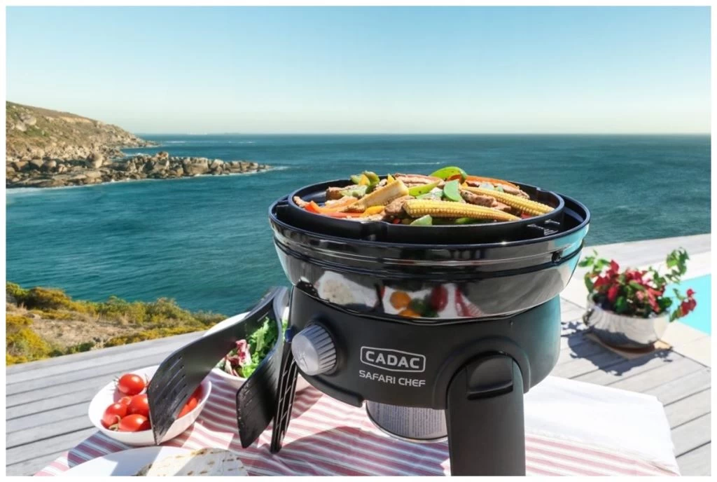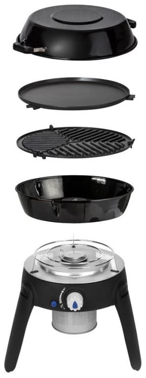 Der Safari Chef ist ein leichtgewichtiger, kompakter Gasgrill und wird mit vier verschiedenen Grilloberflächen geliefert: ein Brenner mit Topfständer, ein Grillrost, eine Grillplatte und einen Topf, der auch als Deckel genutzt werden kann.
