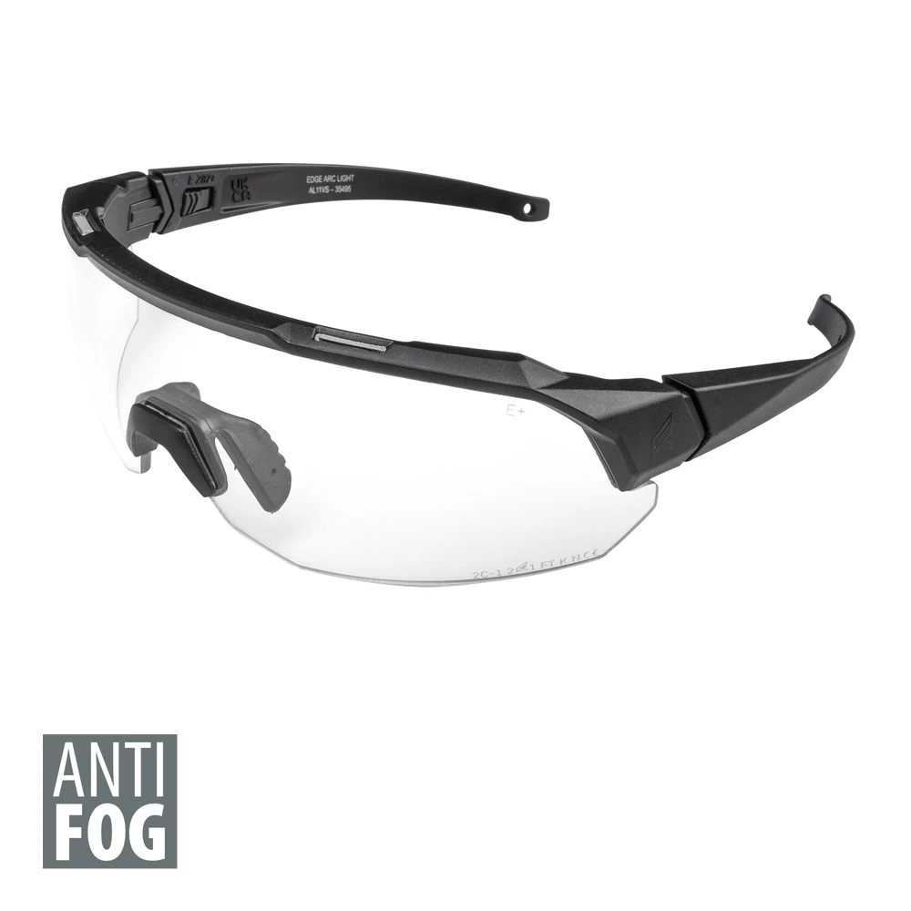 ARCLIGHT Schutzbrille von Edge TacticalSafety Eyewear, mit ballistisch geprüften, 3-fach antikratzbeschichteten, Brillengläsern aus Polycarbonat mit einzigartiger VaporShieldAnti-Beschlag Technologie. Die Gläser der ARCLight sind nach EN166 F CE, ANSI Z87.1 + 2015 und MCEPS(Military Combat Eye Protection Systems) GL-PD 10-12 getestet. Das Glas filtert 99,9 % der UVA/UVB/UVCStrahlung. Der bequem und fest am Kopf sitzende Wrap-AroundRahmen mit gummiertem Nasenbereich und Bügelenden ist aus unverwüstlichem TR-90 Nylon Polyamid, nach EN166 S CE getestet.