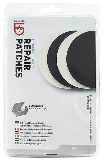 Ein Satz von 4 Reparatur-Patches. Geeignet zur Reparatur von Löchern und Rissen in Zelten, Planen, aufblasbaren Gegenständen, Schlafsäcken, Jacken, Regenbekleidung usw. Dieses Set enthält 2 schwarze Nylonpatches und 2 transparente PVC-Patches für praktisch unsichtbare Reparaturen. Unabhängig vom Wetter bleiben diese Pflaster intakt und blättern aufgrund von Sonne oder Regen nicht ab.