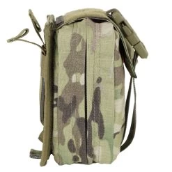 Das Design der IA Medical Pouch QR-Modular MultiCam besteht aus zwei Teilen, einer abnehmbaren medizinischen Tasche mit gut sichtbarem Haltegriff und einer Rückplatte mit QR-Modular-Befestigung. Bei normalem Gebrauch wird der abnehmbare Beutel mit Klettband und einer Schnalle an der Rückplatte befestigt. Bei Bedarf kann die Schnalle gelöst und der Beutel abgezogen werden, damit er zum Opfer und zur Notstelle gebracht oder geworfen werden kann. Das modulare QR-MOLLE System ermögliche schnelles Auf- und Absetzen und sicheren Halt an MOLLE Schlaufen.