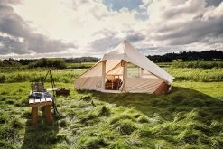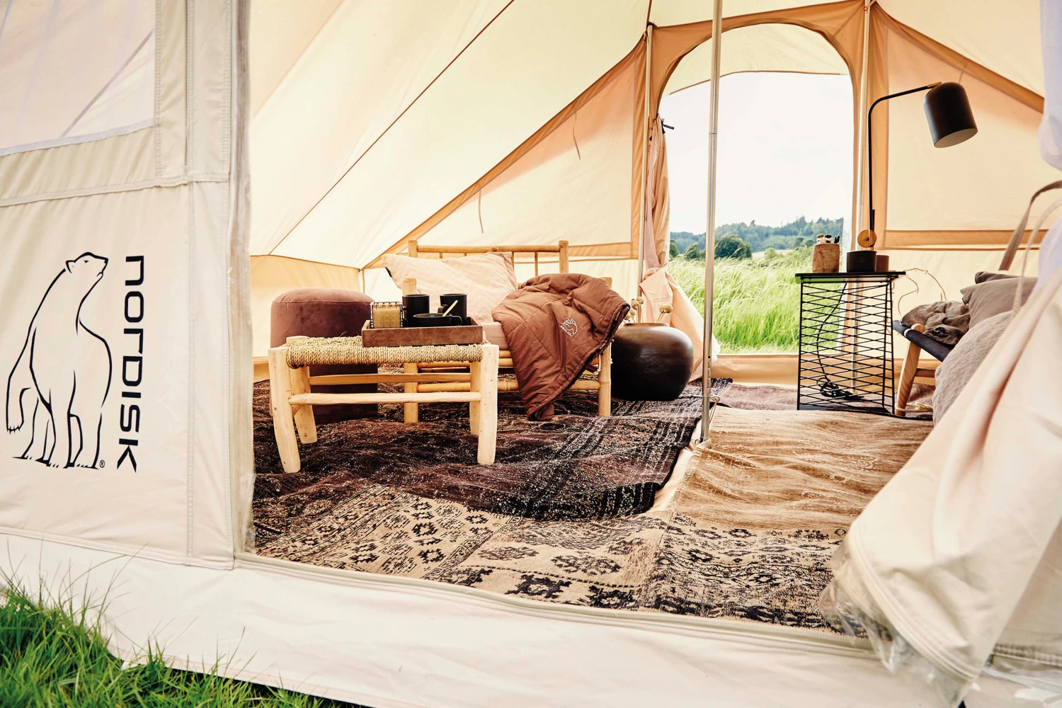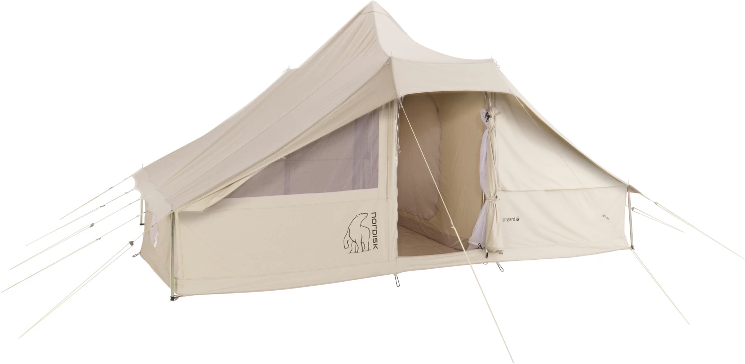 Mit dem Familienzelt Utgard 13.2 realisierte Nordisk ein Zelt, fast wie ein „Tiny-Haus“. Es bietet Platz für bis zu 6 Personen und durch seine rechteckige Form eignet es sich perfekt für größere Biwaks oder einem Glampingurlaub. Mit einer Tür und zwei großen Fenstern an jedem Zeltende, kombiniert mit zwei kleinen bodentiefen Fenstern auf jeder Seite des Zeltes sind sowohl Belüftung, gute Sicht und Licht gewährleistet. Alle Fenster und Türen sind mit Moskitonetzen ausgestattet. Das atmungsaktive Baumwollmaterial gewährleistet eine hervorragende Schlafumgebung, die das Zelt selbst an heißen Sommertagen kühl hält. Utgard kann mit zusätzlichem Zubehör wie einem maßgeschneiderten Zip-in-Floor Zeltboden sowie zwei herausnehmbaren Kabinen ausgestattet werden.
