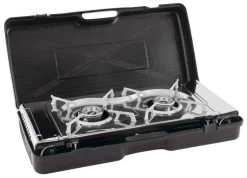 Two-burner piezo ignition stove, each powered by its own easily obtainable gas cartridge for versatile convenience, offers a practical cooking option perfect for groups and families on the move, on the beach or for emergency use.
