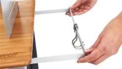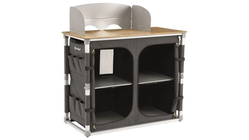 Aus schickem schwarz-grauem Stoff mit massiver Bambustischplatte – mit drei praktischen Haken auf der einen Seite und einer Stautasche auf der anderen Seite. Der Küchentisch enthält einen Halter zum Ausziehen, in dem eine Abwaschschüssel oder ein Müllbeutel Platz findet, sowie einen Windschutz, der verhindert, dass die Flammen eines Brenners ausgeblasen werden.