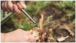 Mit dem Feuerstein können Funken erzeugt und ein Feuer entzündet werden. Großartiger Feueranzünder, unabhängig vom Wetter. Camping ohne Streichhölzer. Wasser- und winddicht. Praktischer Bambus-Griff.