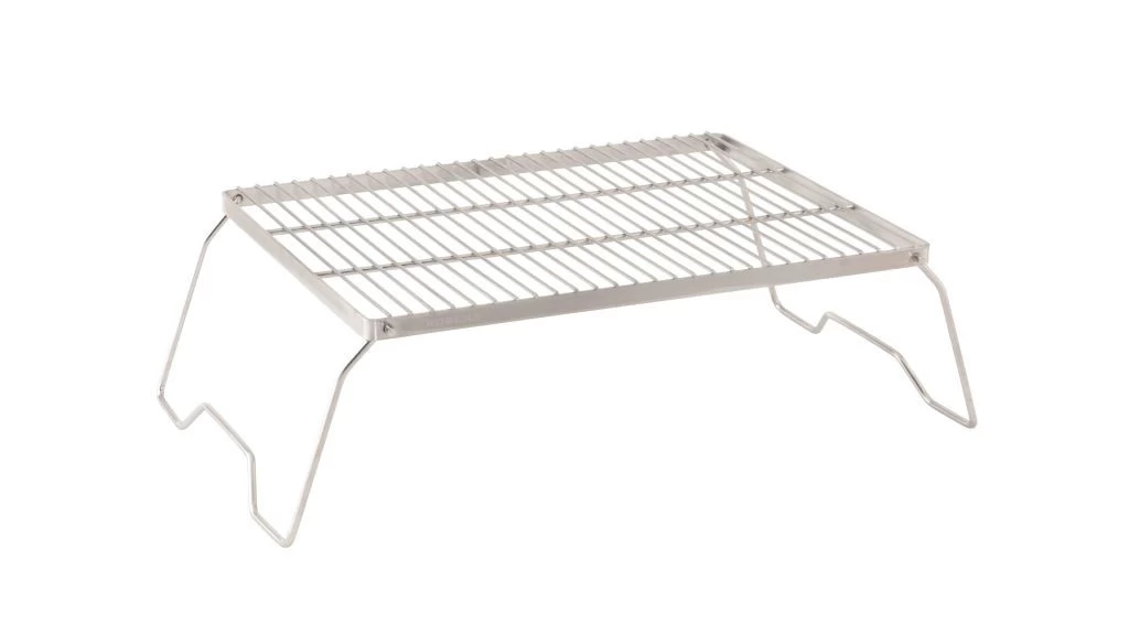 Leicht und kompakt. Rostfreier Stahl. Verwendbar als Grill oder Dreibein. Einklappbare Beine erleichtern den Transport. Inklusive Tragetasche.
