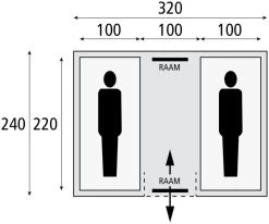 Dieses Tunnelzelt verfügt über zwei Schlafkabinen von 220 x 100 cm. Beide Zimmer haben eine Tür mit einem Moskitonetzfenster. Der Zwischenraum hat eine feste PE-Grundplatte. Das atmungsaktive Material und der Raum zwischen Außen- und Innenzelt sorgen für eine bessere Luftzirkulation.