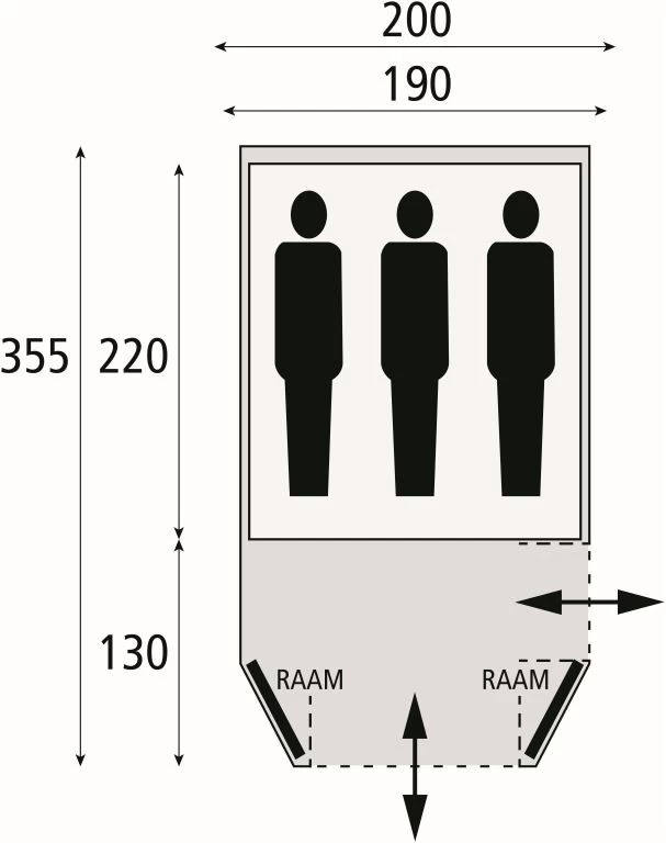 | Zeltboden | 100% Polyethylen eingenähter Zeltboden in Frontaufbau |