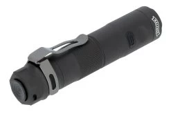 Die EFA1 Taschenlampe ist bestückt mit einer AA-Batterie (1,5 V Mignon) bietet sie 4 Helligkeitsstufen (5/30/60/150 Lumen). Bei Verwendung eines Akkus Typ 14500 steigt die Maximalleistung auf beachtliche 350 Lumen. Ein/Aus und Momentlicht wird per Heckschalter geschaltet, während die Helligkeitsstufen sowie die Sondermodi (Stroboskop und Beacon) über den Seitenschalter aktiviert werden. Der Lichtstärkenspeicher stellt sicher, dass die EFA1 immer auf der Stufe startet, auf der sie zuletzt benutzt wurde. Die Restkapazitätswarnung gibt unter 25 % Restspannung ein Signal. Der abnehmbare Edelstahlclip ermöglicht komfortables Tragen. Das solide Alugehäuse ist hartanodisiert und wasserdicht nach IPX8.