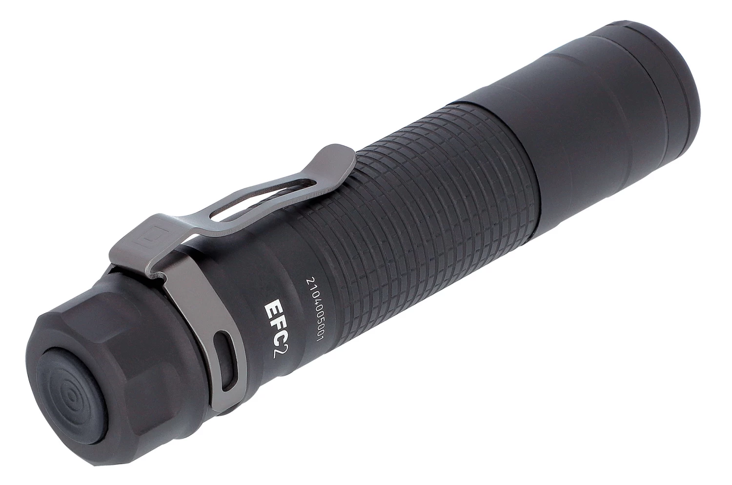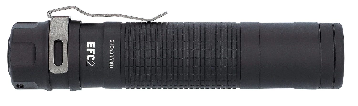 Die EFC2 Taschenlampe ist bestückt mit zwei CR123-Batterien (3 V Lithium) oder einem Li-Ionen-Akku Typ 18650 bietet sie 4 Helligkeitsstufen (5/40/350/1000 Lumen). Bei Verwendung eines Akkus Typ 21700 steigt die Maximalleistung auf 1200 Lumen. Ein/Aus und Momentlicht wird per Heckschalter geschaltet, während die Helligkeitsstufen sowie die Sondermodi (Stroboskop und Beacon) über den Seitenschalter aktiviert werden. Der Lichtstärkenspeicher stellt sicher, dass die EFC2 immer auf der Stufe startet, auf der sie zuletzt benutzt wurde. Die Restkapazitätswarnung gibt unter 25 % Restspannung ein Signal. Der abnehmbare Edelstahlclip ermöglicht komfortables Tragen. Das solide Alugehäuse ist hartanodisiert und wasserdicht nach IPX8.